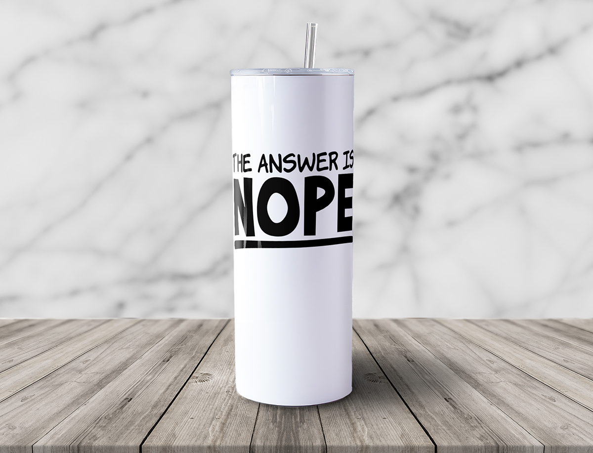 Introducing our delightfully straightforward 20oz Skinny Tumbler with Straw, featuring the succinctly expressive phrase: “The Answer is Nope.” Embrace the power of simplicity and let this tumbler do the talking for you.